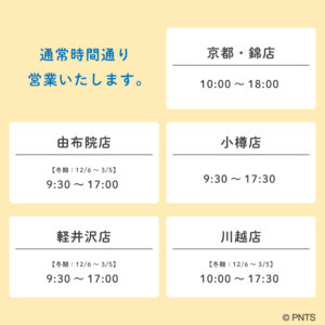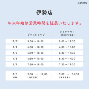 WOODSTOCK NESTは年末年始も営業いたします! 営業時間につきましては店舗毎に異なりますので、 下記画像をご確認ください。 < ウッドストックのハッピーなイエローで明るい新年に♪ 年末年始も皆様のご来店をお待ちしております。 ※SNOOPY Village、SNOOPY茶屋、SNOOPY Chocolatも同様に営業いたします。